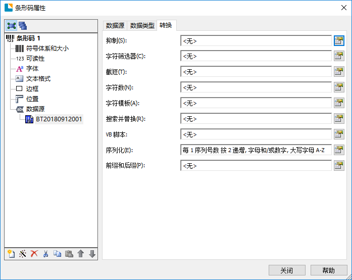 2. 在“條形碼屬性”對話框右側(cè)選擇“轉(zhuǎn)換”選項卡,單擊“序列化”右側(cè)的按鈕,進入“序列設(shè)置”對話框