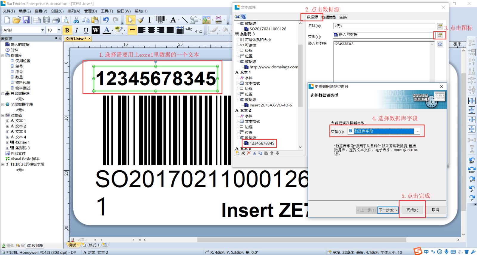 5、如何將標(biāo)簽?zāi)0逯械奈谋炬溄觘xcel文件中相對(duì)應(yīng)的字段,請(qǐng)看下圖的操作指示: