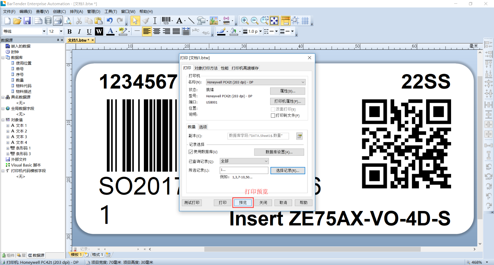 7、好了,演示標(biāo)簽的模板已經(jīng)有5個(gè)文本鏈接了excel文件里相對(duì)應(yīng)的字段了,那我們也把每行數(shù)據(jù)要打印的數(shù)量也鏈接excel文件里的“數(shù)量”字段吧,要做就做到全自動(dòng)
