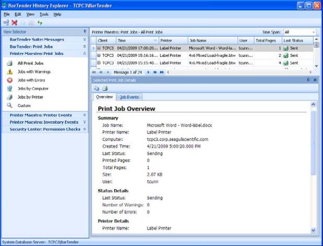 Bartender在9.0版本后增加了一個(gè)History Explorer功能,它在Printer Maestro中,History Explorer可以查看打印任務(wù)的相關(guān)數(shù)據(jù),如下圖所示: